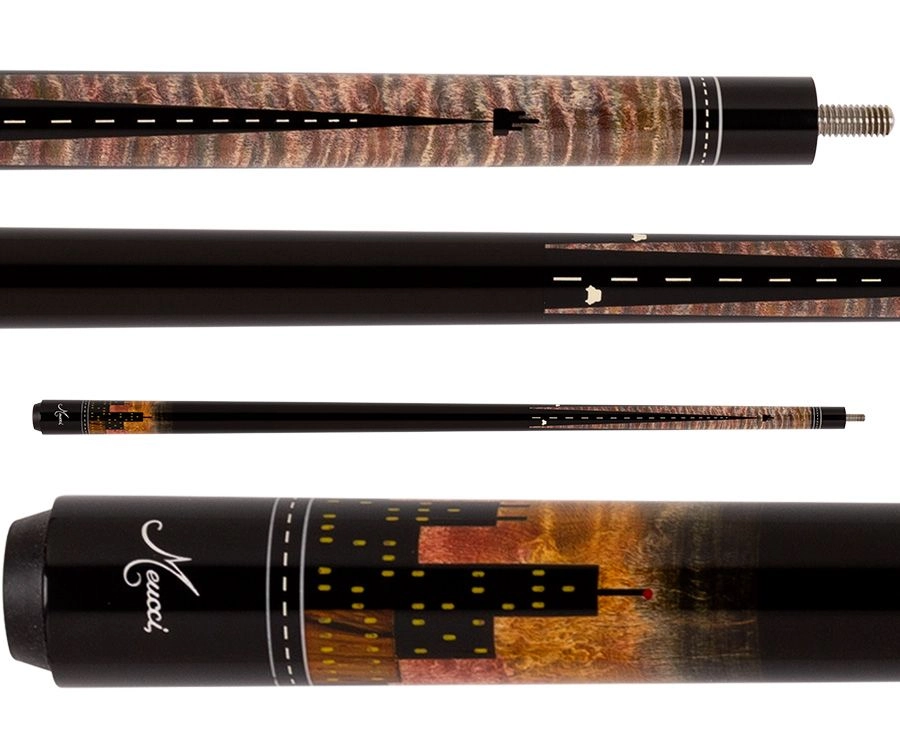 This Meucci Hall of Fame cue is designed to evoke the skyline of a city at sunset. The butt plate features a stark black skyline set against a wide range of bright oranges and dusky greys, broken up with backlit windowpanes. Meucci Pool Cues. Along the forearm, in place of points, this cue has a series of long highways heading off into the distance toward a new city, also surrounded by the warm colors of early evening. The cue is centered with a lacquered-over night black wrap.
